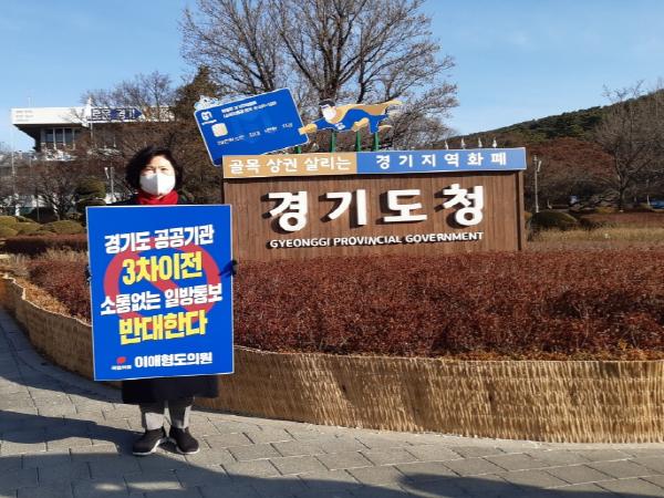 [한국연예축제일보, 허난세기자] 경기도의회 교육기획위원회 이애형 의원(국민의힘, 비례)은 2월 22일 이재명 경기도지사가 발표한 ‘경기도 공공기관 3차 이전 계획’에 대하여 반대 입장을 밝히며 오늘 경기도청 앞 정문에서 1인 시위를 펼쳤다.