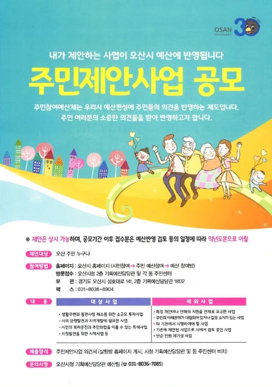 제안 사업의 신청은 오산시민 및 오산시 소재 기관, 사업체 종사자, 청소년 등 누구나 참여 가능하며, 오산시 홈페이지 ▶ 시민참여 ▶ 톡톡! 시민 아이디어 제안방 ▶ 주민참여예산제 ▶ 주민예산참여방을 통해 신청하거나 방문 또는 우편 신청도 가능하다.