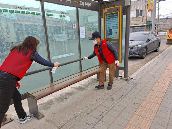 이번 봉사활동은 포승읍 주민자치위원회 22명의 위원이 참여한 가운데, 포승 관내 방역취약지역 및 버스승강장 등 다중공공이용시설을 중점으로 방역 소독을 진행했다.