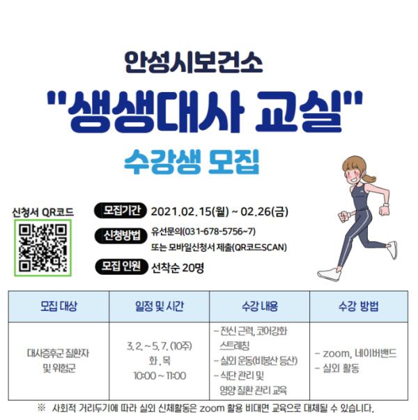 [한국연예축제일보, 황해식기자] 안성시보건소는 오는 3월 2일부터 대사증후군 질환자와 위험군을 대상으로 운동 프로그램 생생대사 교실을 운영한다고 밝혔다.