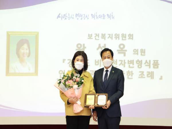 [한국연예축제일보, 허난세기자] 왕성옥 경기도의원(더민주, 비례)이 23일 경기도의회에서 열린 '2020년도 도의회 우수 조례’시상식에서「경기도 비유전자변형식품의 인증 및 관리에 관한 조례」로 수상의 영광을 안았다.