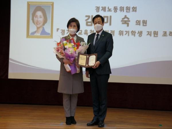 '2020년도 도의회 우수조례’는 2021년도 제1회 입법정책위원회 결정에 따라, 2020년도에 발의된 도의회 중 우수조례로 선정된 대표 발의 의원에게 표창하는 것이 목적으로 김미숙 의원이 발의한 「경기도교육청 심리적 위기학생 지원 조례」가 우수한 조례로 인정받았다.