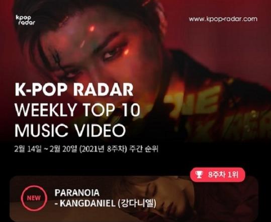 강다니엘의 신곡 ‘PARANOIA(파라노이아)’ 뮤직비디오는 케이팝 레이더 8주차 집계 기간 (2월 14일 ~2월 20일) 동안 1,787만 뷰를 기록하며 1위에 올랐다.