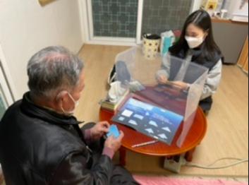 치매 어르신 가정에 방문하는 작업치료사들은 손 소독, 발열체크, 마스크 착용, 가림막 사용 등 방역지침을 준수하며 프로그램을 진행하고 있다.