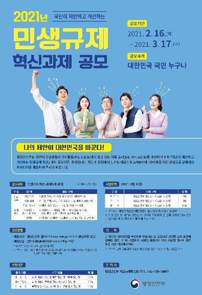 민생규제 혁신과제 공모 분야는 국민복지, 일상생활, 취업·일자리, 소상공인·중소기업 지원, 신산업 등 총 5개 분야로 공모 횟수에 제한 없이 시민 누구나 참여 가능하다.