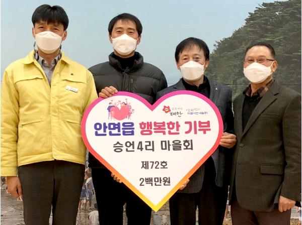 [한국연예축제일보, 이순례기자] ‘승언4리 마을회’가 지난 23일 안면읍지역사회보장협의체가 추진하는 ‘안면읍 행복한 기부’에 200만 원을 기탁했다.