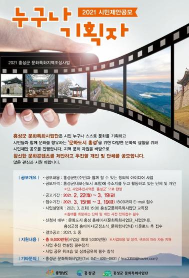 [한국연예축제일보, 이순례기자] 홍성군 문화특화지역조성사업추진사업단(이하 사업단)은 3월 19일까지 2021년 시민제안공모 ‘누구나 기획자’ 사업을 추진할 개인 및 단체를 모집한다.