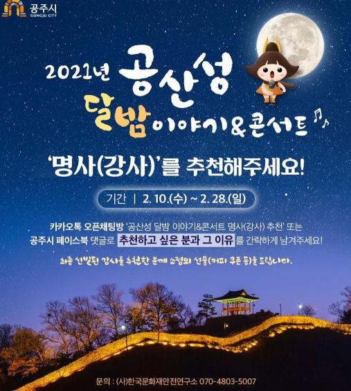 [한국연예축제일보, 이순례기자] 공주시는 오는 5월부터 8월까지 진행될 ‘공산성 달밤이야기콘서트’에서 만나고 싶은 명사를 온라인을 통해 추천받는다.