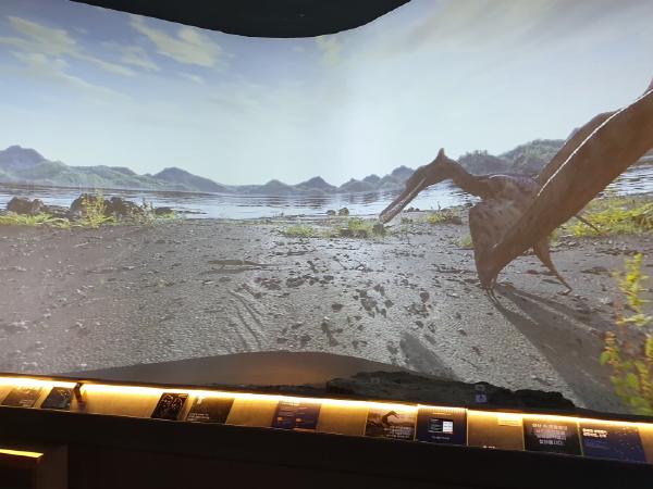 화석 전시실에 들어서면 익룡과 공룡이 살았던 시대의 풍경을 만나 볼 수 있는데 벽면 전체를 활용한 프로젝션 맵핑에는 실제 전시된 화석의 이야기와 익룡의 시선으로 중생대 백악기의 생태계를 들여다 볼 수 있다. 두 눈에 꽉차는 영상을 통해 익룡과 함께 날아다니는 효과와 재미를 느낄 수 있다.