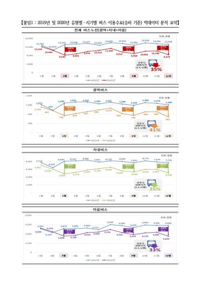특히, 코로나19 심화시기인 3월(3단계: '20. 2. 23. ~ 6. 28.), 9월(2.5단계: '20. 8. 30. ~ 9. 13.), 12월(2.5단계: '20. 11. 30. ~ 12. 31.)에는 '19년 동기 대비 35%가 감소, 광역 41%·시내 35%·마을 33%의 감소율로 분석됐고, 평일 31% 및 휴일은 50% 감소율로 나타나 휴일 노선버스 유동인구는 절반 가까이 급감한 것으로 나타났다.