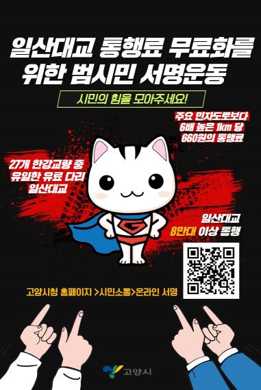 [한국연예축제일보, 유혜경기자] 고양시가 24일 일산대교 통행료 무료화를 위한 범시민 서명운동을 진행하고 있다고 밝혔다.