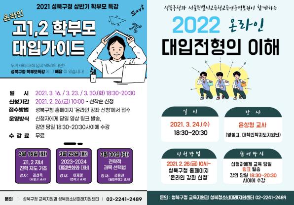 성북구청은 다가올 3월에 고3을 위한 ‘2022 대입전형의 이해’ 및 고1, 2를 위한 ‘고1, 2 학부모 대입 가이드(3강)’를 온라인으로 진행하여, 코로나19에 따른 입시공백을 최소화하고 관내 학부모 및 수험생의 접근성을 높이는 데 기여한다. 강의를 수강하고자 하는 구민은 성북구청 홈페이지 온라인 강좌 신청 혹은 모집강좌 게시판을 참고하여 2월 26일(금) 10시부터 신청하면 된다.