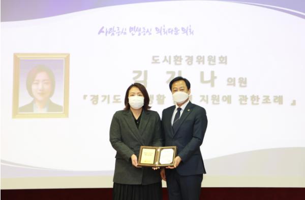 [한국연예축제일보, 허난세기자] 경기도의회 도시환경위원회 김지나(민생당) 의원은 23일 경기도의회 대회의실에서 개최된 ‘2020년도 도의회 우수조례 시상식’에서 ‘우수조례’ 표창을 수상했다.
