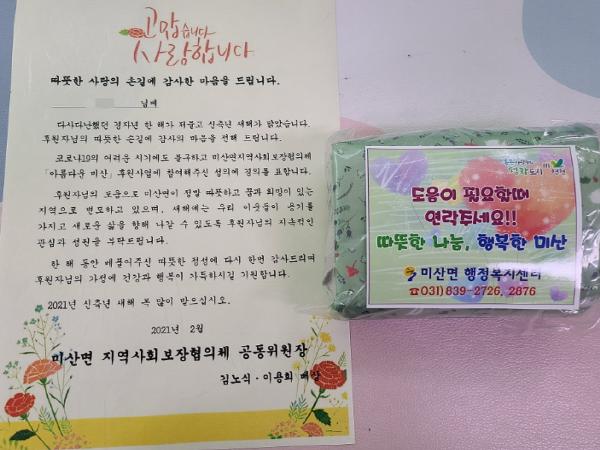 [한국연예축제일보, 유혜경기자] 연천군 미산면 지역사회보장협의체은 지난 23일, 2020년 한 해 동안 관내 저소득층을 위해 기부한 87명의 후원자들에게 사랑의 감사 서한문과 함께 소정의 홍보 물품 보온보냉백을 전달하였다.