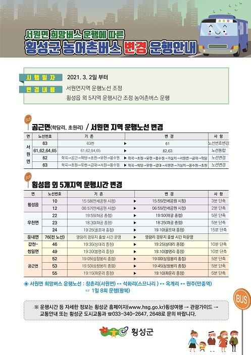 주요 조정 내용으로는 서원면 희망버스 운행에 따른 기존 노선 통합 및 변경, 횡성읍 외 5개면 운행시간 변경 등이다.