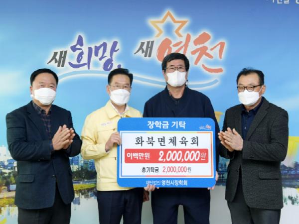 화북면체육회는 주민들의 체력증진과 주민화합을 도모하며 건전한 사회 분위기 조성을 위해 노력하고 있으며 지역 인재양성에도 뜻을 두어 이번에 200만원의 장학금을 영천시장학회에 기탁했다.
