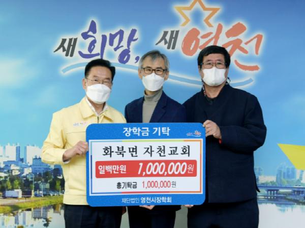 [한국연예축제일보, 유혜경기자] 영천시는 화북면체육회에서 200만원, 화북면 자천교회에서 100만원의 장학금을 (재)영천시장학회에 기탁했다고 밝혔다.