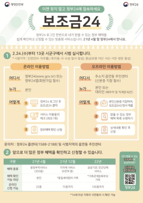 더불어, 비대면 방식에 어려움을 느끼는 디지털 소외 계층도 가까운 주민센터에 방문하면 ‘보조금24’와 동일한 서비스를 받을 수 있게 된다.