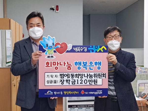 [한국연예축제일보, 유혜경기자] 대구광역시 수성구 범어1동 희망나눔위원회는 지난 22일 범어1동행정복지센터를 방문해 저소득가정 중?고등학교 신입생들을 위해 장학금 120만원을 기탁했다. 이 장학금은 신입생 4명에게 각 30만원씩 전달됐다.