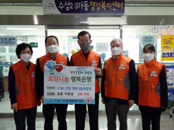 [한국연예축제일보, 유혜경기자] 대구광역시 수성구 수성2·3가동 희망나눔위원회는 지난 23일 저소득가정 학생들을 위해 써달라며 교복구입비 180만원을 전달했다. 이 교복구입비는 저소득가정 중·고등학교 입학생 9명에게 사용될 예정이다.