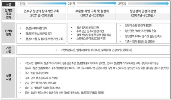 이어 3단계(2024~2025)는 청년정책의 안정적 운영을 목표로 소통 참여 활성화, 거버넌스의 안정적 운영, 정책 수혜자 만족도 향상, 기존사업의 활성화와 고도화 등에 주력할 방침이다.