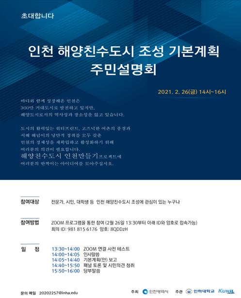 [한국연예축제일보, 유혜경기자] 인천광역시는 2월 26일 인천 해양친수도시조성 기본계획 방향 및 사업 등을 설명하고 시민의 다양한 의견을 수렴하기 위해“주민설명회”를 개최한다고 밝혔다.