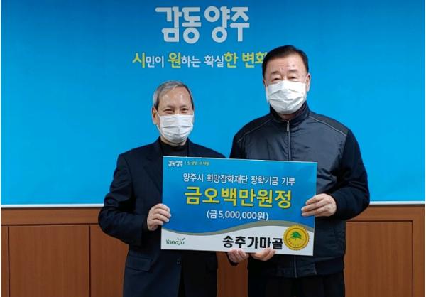 [한국연예축제일보, 유혜경기자] 양주시 희망장학재단(이사장 임충빈)은 지난 23일 송추가마골(대표 김재민)에서 지역인재육성을 위해 써달라며 장학금 500만원을 기탁했다고 밝혔다.