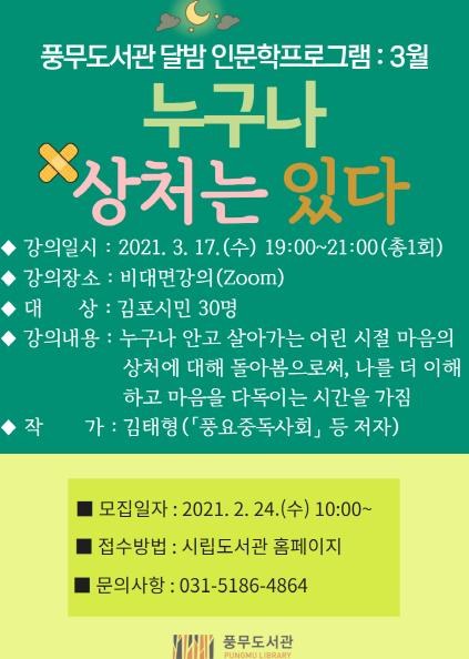 [한국연예축제일보, 이순례기자] 김포시 풍무도서관은 2021년 연간 프로그램 「열 가지 주제프로그램 - 도서관으로 가는 열 개의 계단」의 두 번째 주제인 심리학과 관련하여 「누구나 상처는 있다」 강좌를 운영한다.
