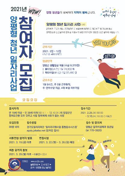 신청은 경기도일자리재단 ‘일자리지원사업 통합접수시스템’를 통해서만 접수가능하며, 자격요건, 근로조건 등은 양평군청 홈페이지 알림마당-고시공고 ‘양평형 청년 일자리’를 검색하면 확인할 수 있다.