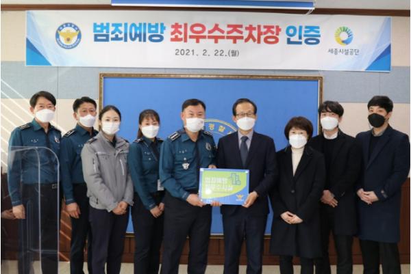 [한국연예축제일보, 유혜경기자] 세종특별자치시시설관리공단 공영주차장은 지난 22일 공단 및 세종경찰서 관계자들이 참여한 가운데 ‘범죄예방 최우수시설 인증패 수여식’을 가졌다.