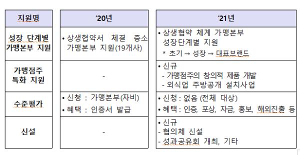2021년 선정 규모는 약 9개사이며 ①초기단계는 약 5개사에 최대 3,000만원까지, ②성장 및 대표브랜드 단계는 약 4개사에 최대 5,000만원까지 프랜 차이즈화에 필요한 다양한 사업화 지원을 받을 수 있다.