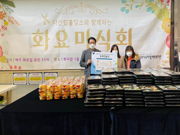 '화요미식회'프로젝트는 코로나19 장기화로 식생활에 어려움이 생긴 저소득 및 중증장애인의 건강한 생활을 지원하기 위한 프로젝트이다. ㈜다인탑홀딩스가 후원한 500만원을 통해 영양 도시락 100인분을 준비할 수 있었다. 앞으로도 주1회(매주 화요일) 계속적인 후원과 도시락 배달 자원봉사활동에 참여하기로 약속하였다.
