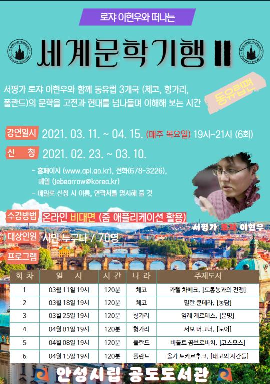 [한국연예축제일보, 이순례기자] 안성시 공도도서관은 오는 3월 11월부터 4월 15일까지 6주간 매주 목요일 오후 8시에 이현우 작가를 초청해 ‘로쟈 이현우와 떠나는 세계문학기행 동유럽 편’ 강연회를 운영한다고 밝혔다.