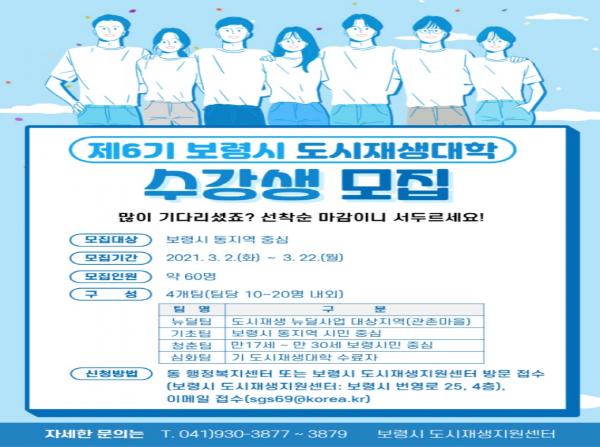 [한국연예축제일보, 유혜경기자] 보령시는 오는 22일까지 도시재생사업에 대한 전반적 이해 및 주민주도의 상향식 도시재생 체계 확립을 위해 제6기 도시재생대학 수강생 60명을 모집한다.