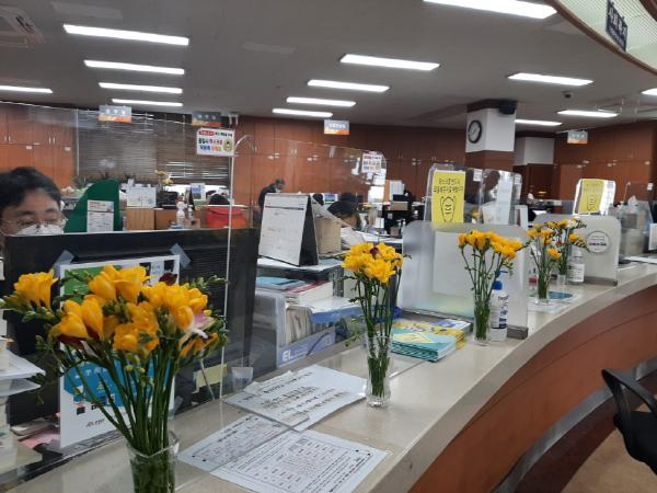 서천읍은 관내 화훼농가에서 프리지아를 구매해 전 직원 책상 및 사무실 곳곳에 비치해 지역경제 활성화를 도모하는 한편 방문 민원인들에게 화사한 청사이미지를 제공하고 있다.