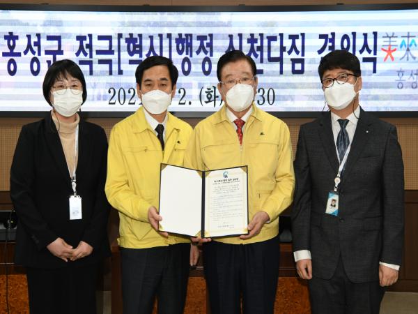[한국연예축제일보, 이호진기자] 홍성군은 2일 군청 회의실에서 전 군민이 체감하는 신뢰?소통 행정 구현을 위한 ‘적극?혁신행정 실천다짐 결의식’을 갖고 새로운 변화에 발 빠르게 대응하기 위해 모든 공직자가 한마음으로 적극행정을 실천할 것을 다짐했다.