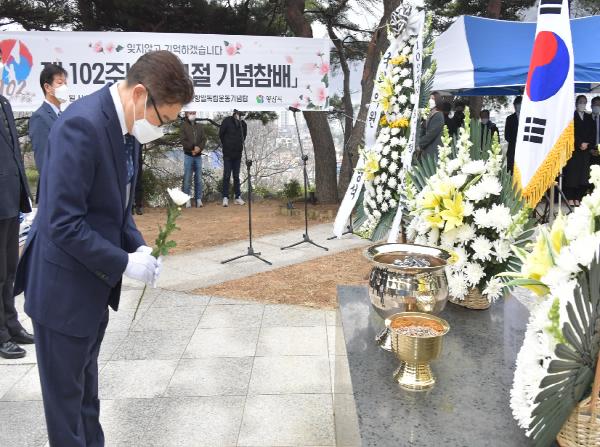 [한국연예축제일보, 유혜경기자] 양산시는 제102주년 3·1절을 맞이하여 순국선열과 애국지사의 숭고한 뜻을 기리기 위해 물금읍 디자인공원에 위치한 양산항일독립운동기념탑에서 참배를 진행했다.