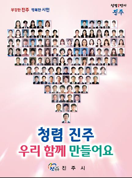 청렴포스터는 '청렴 진주'우리 함께 만들어요 라는 슬로건으로 진주시장을 비롯한 간부 공무원에서 신규직원까지 100명의 얼굴 사진으로 구성되었다.
