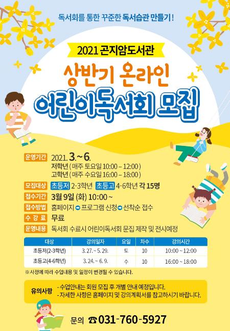 [한국연예축제일보, 유혜경기자] 광주시 곤지암도서관은 건전한 독서습관 형성과 독서문화 증진을 위해 ‘2021년 상반기 온라인 어린이독서회’ 회원을 모집한다.
