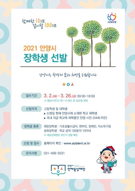 [한국연예축제일보, 유혜경기자] 안양시 인재육성재단은 “2021 안양시 장학생 선발”을 위해 3/2~3/26일까지 25일간 장학금 신청을 받는다고 밝혔다.