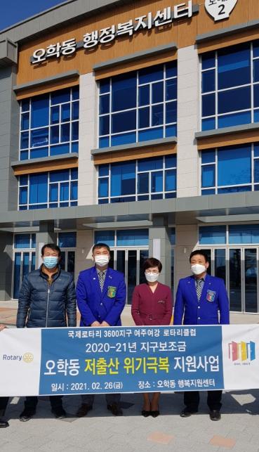 한편, 여주여강로타리클럽은 여주 관내 최대 회원이 가입된 로타리클럽으로 각종 사회봉사와 후원에 늘 앞장서 왔으며, 매년 오학동 복지사각지대 지원에 크게 기여하고 있다.