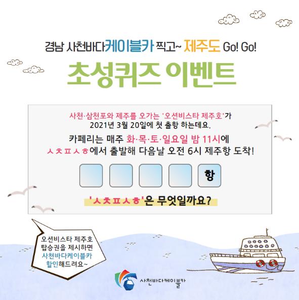 [한국연예축제일보, 이순례기자] 사천시시설관리공단이 만물이 깨어나는 3월을 맞아 오는 4일부터 14일까지 ‘경남 사천바다케이블카 찍고~ 제주도 Go! Go!’초성퀴즈 이벤트를 진행한다.