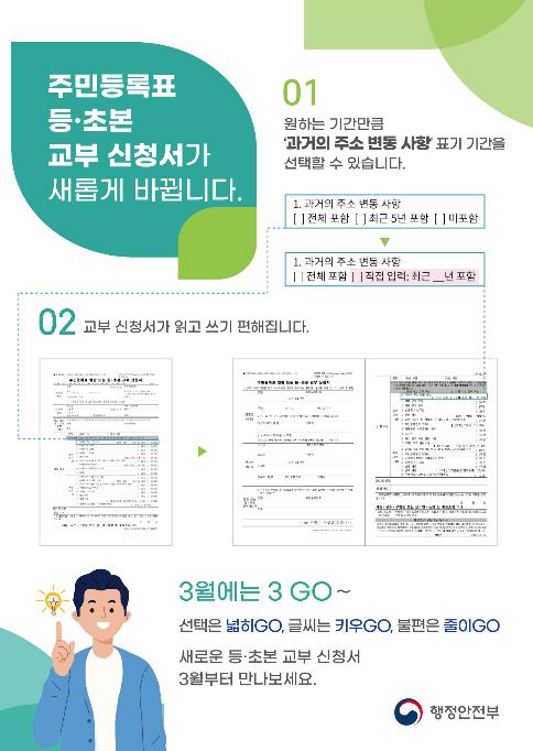 동주민센터 방문 발급은 지난 1일부터 시행되며, 5일부터는 ‘정부24’와 ‘무인민원발급기’를 통한 등·초본 교부 신청에 대해서도 이러한 개정사항이 반영될 예정이다.