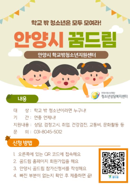 [한국연예축제일보, 유혜경기자] 안양시청소년재단 청소년상담복지센터 부설 학교밖청소년지원센터 꿈드림은 경기도 내 학교 밖 청소년을 대상으로 상담, 검정고시, 취업, 건강검진, 교통비, 문화활동 등을 지원하며 제도권 밖 청소년들의 자립과 성장을 위해 힘쓰고 있다.