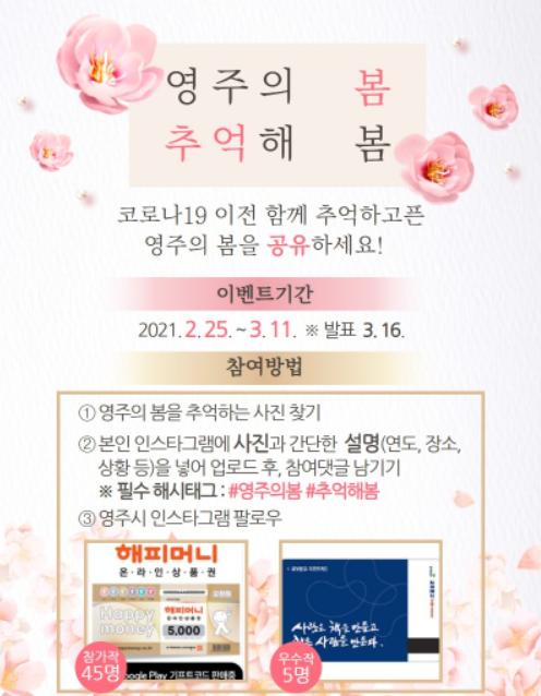 3월 11일까지 실시하는 이번 이벤트는 대한민국 국민이면 누구나 참여 가능하며, ‘코로나19’ 이전 함께 추억하고픈 영주의 봄 사진과 간단한 사연(연도, 장소, 상황 등)을 적어 #영주의봄, #추억해봄 필수 해시태그와 함께 개인 인스타그램에 업로드하면 된다.