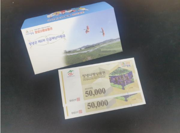 제2차 창녕군 긴급재난지원금은 2021년 1월 26일 지급 기준일부터 신청일 현재까지 계속 창녕군에 주소를 두고 있는 전 군민과 주민등록등본 상 등재 된 결혼이민자이며 지역경제 활성화를 위해 1인당 10만원씩 가구단위로 창녕사랑상품권을 지급하고 있다.