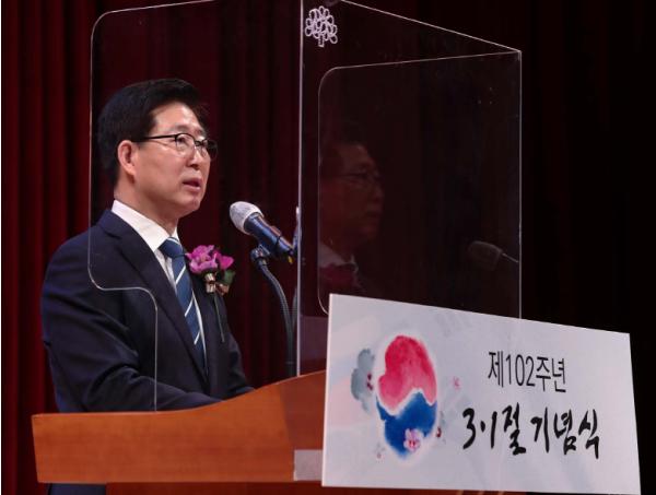 양승조 지사는 기념사를 통해 "102년 전 선열들이 소리 높여 외친 독립만세의 외침은 오천년 역사의 숨결이 토해낸 우리 민족 모두의 함성이었다”며 "1542회의 만세 시위에 당시 우리 인구의 10%에 달하는 200여 만 국민이 참여했다”고 설명했다.