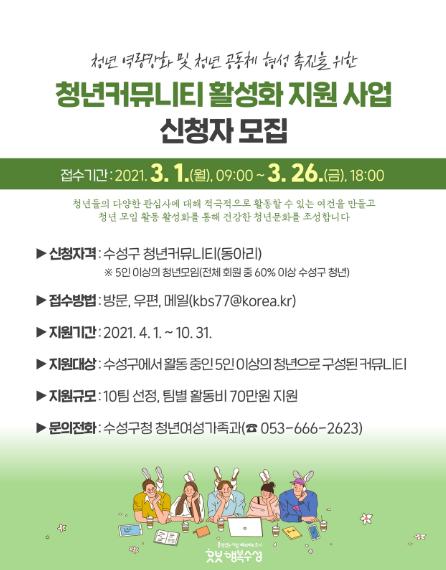 [한국연예축제일보, 안성경기자] 대구 수성구는 오는 26일까지 청년 공동체 형성 촉진을 위한 ‘청년 커뮤니티 활성화 지원 사업’신청을 받는다.