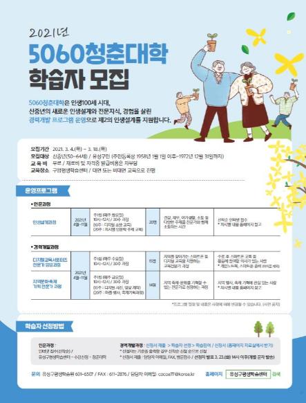 5060청춘대학 참여 신청은 3월 4일부터 3월 18일까지 유성구평생학습센터홈페이지를 통해 가능하며, 기타 자세한 내용은 유성구 평생학습원으로 문의하면 된다.