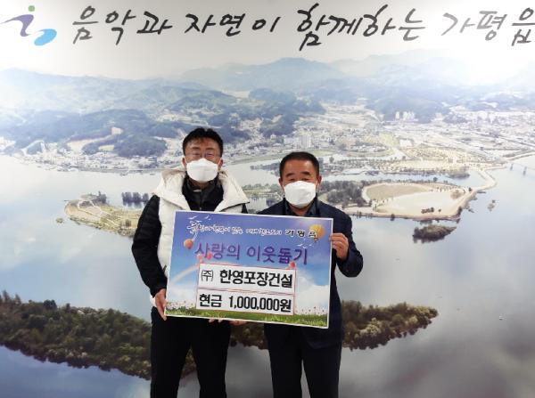 ㈜한영포장건설(대표 용환영)은 2월 26일 가평읍행정복지센터 맞춤형복지팀에 관내 저소득층 주민들을 위해 사용해 달라며 사랑의 이웃돕기 성금 100만원을 기탁했다.